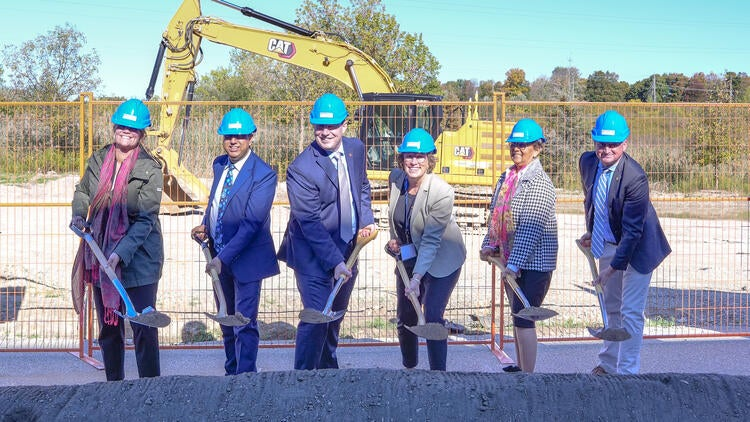 From left to right: Nenone Donaldson, vice-president Advancement and External relations; Deepak Anand, MPP for Mississauga-Malton and Parliamentary Assistant to the Minister of Colleges, Universities, Research Excellence and Security; Dr. Scott Hopkins, professor, Department of Chemistry, Dorothy McCabe, mayor of Waterloo; Dr. Charmaine Dean, vice president Research and International and Dr. Chris Chris Houser, dean, Faculty of Science gather to celebrate the groundbreaking of the Infrared Free Electron Laser facility at the University of Waterloo.