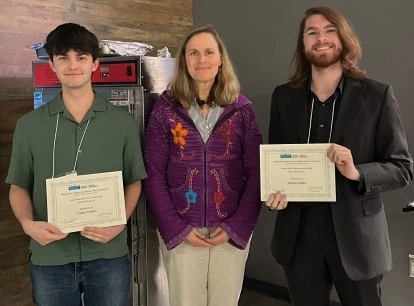 StFX student Carter Clifton (pictured at left) won the Science Atlantic Communication Award in Mathematics. Here, he accepts the award from Dr. Dorette Pronk from Dalhousie University. Also pictured is Anson Green, who won the Science Communication Award in Statistics.