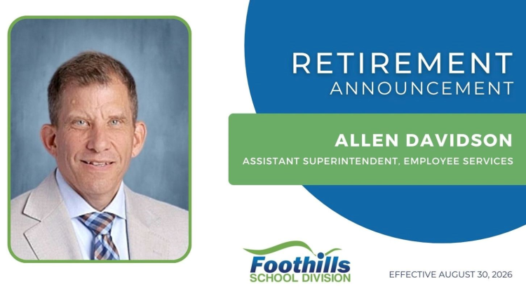 Join us in congratulating Mr. Allen Davidson, Assistant Superintendent of Employee Services for Foothills School Division, on his retirement effective August 30, 2026. Mr. Davidson has had a remarkable 26-year career with Foothills as a guest teacher, teacher, vice principal, principal, and as assistant superintendent in school division leadership. We express our heartfelt gratitude to Al for his incredible contributions to the engagement, support, and success of all learners over the years.
