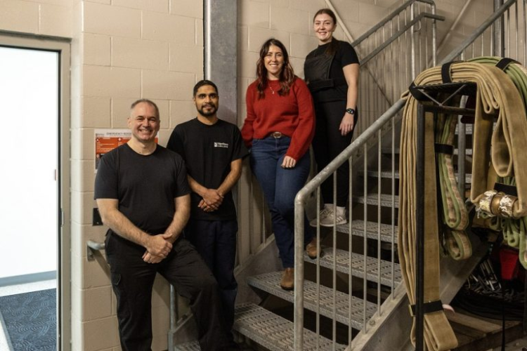 Northern College Emergency Services students successfully completed Operation: Stair Climb, a 24-hour marathon endeavour, walking 100,000 steps and raising 1,325 dollars the annual Timmins Victim's Services Toy Drive. From left to right: Rick Lemieux, Police Foundations Program Coordinator, Arshdeep Singh, Police Foundations Student, Christine Raycraft, Dean of Business and Community Services and Mikaela Woods, Timmins Victim's Services.