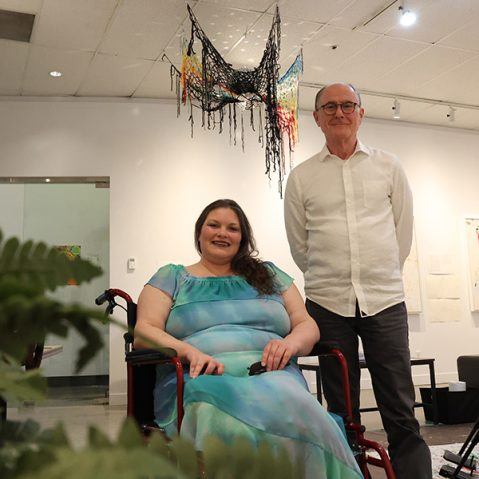 Artist Fae Lyn (left) with Martin in front of mixed media work Net Loss.