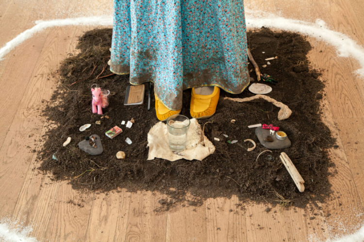 Jodi Lynn Maracle's sculpture and performance installation, What do you carry? What do you leave behind?' with soil, calico, deer hide, salt, found objects at the Gardiner Museum, August 2018; part of Blood Soaked Soil. (Submitted)