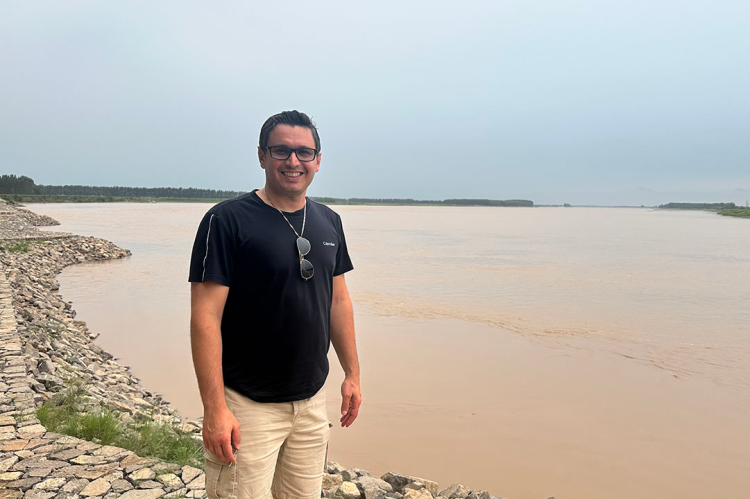 SENS hydrology researcher Dr. Saman Razavi (PhD) at the Yellow River in China during a research visit in August 2025. (Photo: Submitted)