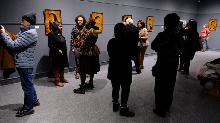The exhibition invites viewers into a powerful encounter with Black identity and lineage, as Gary Weekes' portraits, set against fire-scarred baking trays, confront, connect and reveal the soul through subjects' gazes.