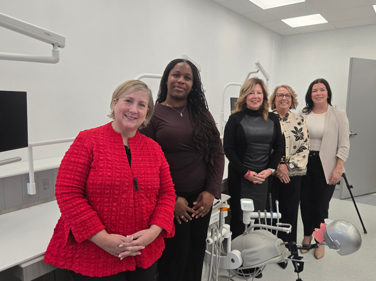 Sudbury MP Viviane Lapointe announced $2.6 million in federal funding for Cambrian's new Dental Simulation Lab and Dental Assisting Levels 1&2 program. Pictured are (left to right): Janice Clarke, VP Academic; Daniella Israel, Dental Hygiene student, Viviane Lapointe; Terri Gainer, Manager of Health Clinics; Carli Wright, Dental Assisting Program Coordinator.
