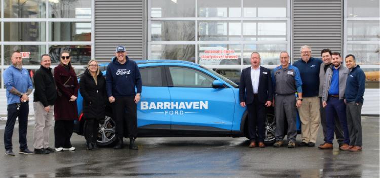 From left to right: David Young (Service Manager, Barrhaven Ford), Jeffery Newson, Katherine Root (Dean, Algonquin Centre for Construction Excellence, Algonquin College), Mistalyn Seguin (Director of Philanthropy, Algonquin College), AC alum "Stuntman Stu" Schwartz (Spokesperson, Barrhaven Ford), Shaun Barr (Chair, Apprenticeship Training, Automotive and Mechanical Trades, Algonquin College), Don Pidgeon (Shop Foreman, Barrhaven Ford), Mark Bonneau (General Manager, Barrhaven Ford), Tyler Stack (EV Specialist, Barrhaven Ford), Anthony Van Volkenburg (EV Sales Product Manager, Barrhaven Ford), and David Dhungana (General Sales Manager, Barrhaven Ford).