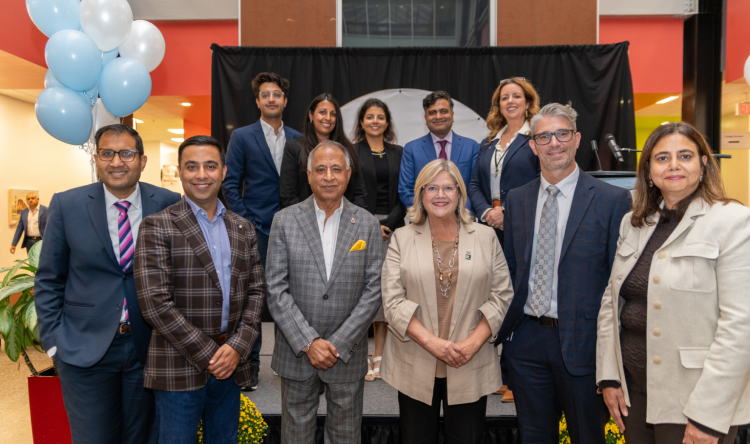 Front row, from left: Paras Dharamshi, Anil Jasuja, Arjun Jasuja, from Sigma Group; Hamilton Mayor Andrea Horwath; Gianni Parise, McMaster vice-president, Research; Saher Fazilat, vice-president, Operations and Finance. Back row, from left: Rishi Kothari, Kothari Group; Anita Dharamshi, Sigma Group; Trishla?Kothari, Kothari Group; Anupam Kothari, Kothari Group; McMaster Innovation Park CEO Gailene Tobin Vandenheuvel.