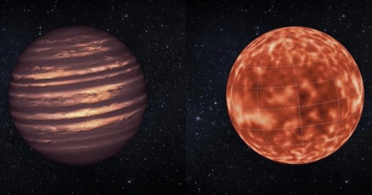 Artistic impression of the long-held astronomical view that brown dwarfs resemble Jupiter in appearance, displaying prominent multiple zonal bands and stable vortices similar to the Great Red Spot. This Jupiter-like atmospheric circulation formed the basic picture for explaining brown dwarfs' large-amplitude variability. On right, a model of atmospheric circulation for super-Jupiter VHS 1256B. (NASA/JPL-Caltech)
