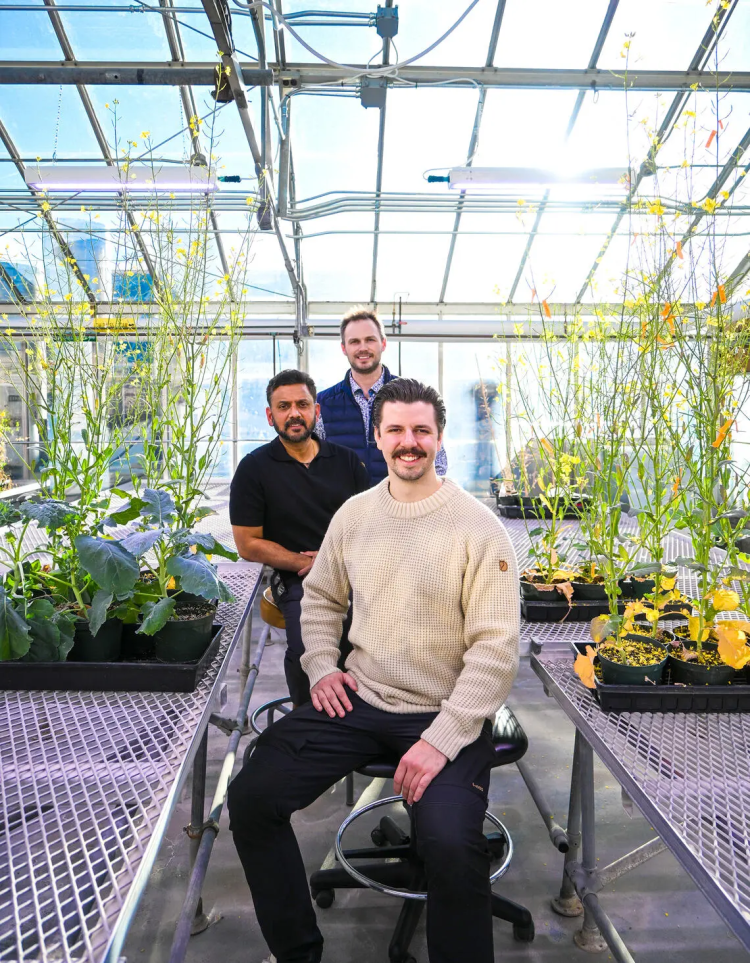 From front to back: Justin Nichol, Marcus Samuel and Logan Skori in the greenhouse on Jan. 11, 2026. Photo Courtesy of Luis Prada, Faculty of Science