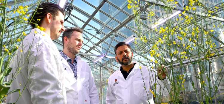 From left: Justin Nichol, Logan Skori and Marcus Samuel take a look at a canola plant in the UCalgary greenhouse. Photo Courtesy of Luis Prada, Faculty of Science