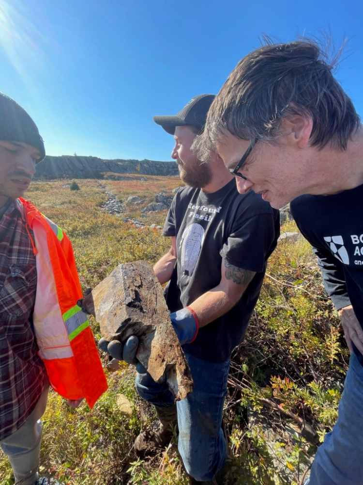 At far right is Dr. Rod Taylor and Simon Rosse-Guillevic discussing a fossil of Trepassia on a loose block that Ben Rideout is holding, which they sometimes find around the surface. Dr. Rideout is Mr. Rosse-Guillevic's co-supervisor. Photo: Submitted