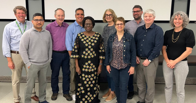 Core faculty members of the IMMUNEQUITY team, following a lecture at the Schulich School of Medicine & Dentistry presented by international collaborator Dr. Cissy Kityo Mutuluuza (front centre) in June 2025. The world-renowned Ugandan HIV/AIDS researcher and executive director of the Joint Clinical Research Centre (JCRC) visited campus last summer for early planning meetings for the initiative and to receive an honorary doctor of science degree from Western. (Maria Drangova/Schulich Medicine & Dentistry)