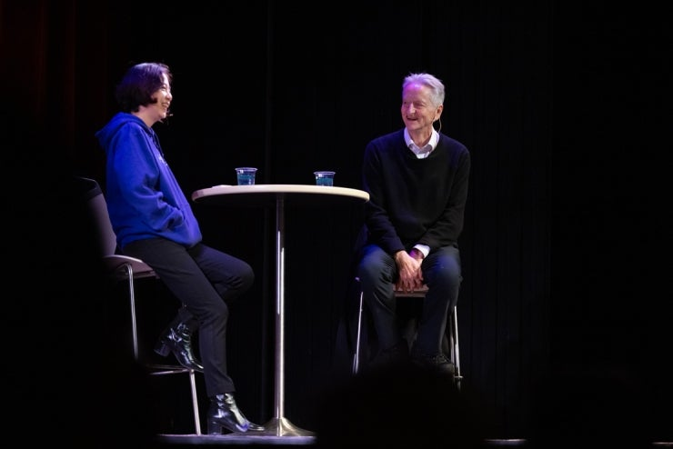 Fei Fei Li, left, co-director of Stanford University's Institute for Human-Centered AI, and Geoffrey Hinton, right, a U of T University Professor Emeritus who is known as the "Godfather of AI," in conversation at the recent Who's Afraid of AI? conference (photo by Johnny Guatto)