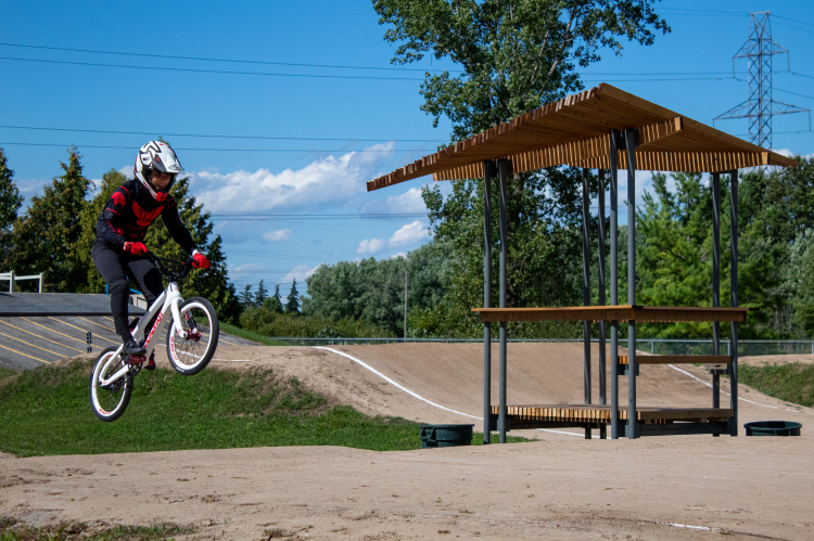 A BMX rider takes a jump next to the new announcing tower pavilion at Wolfe Creek BMX Racetrack in Chatham. (Bill Rawlings/St. Clair College)