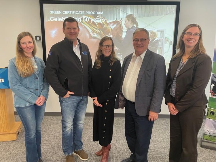 Jessi Selte, Minister Sigurdson, Dr. Wainwright-Stewart, MLA Rowswell and Jennifer Stoby celebrate 50 years of Alberta's Green Certificate Program.
