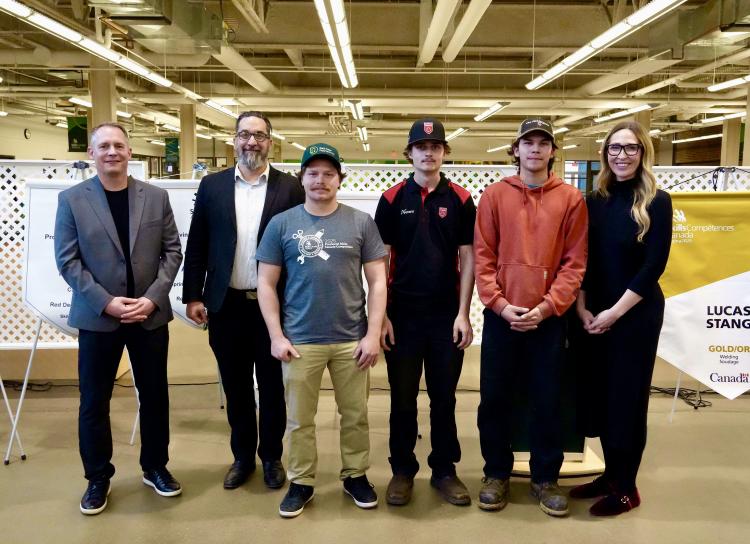 Left to right : Chris Browton, Executive Director, Skills Canada Alberta; David Pye, Dean, School of Trades and Technology at RDP; Carson Donovan (Steamfitter/Pipefitter), silver medalist at Skills Canada Alberta; Lucas Stang (Welding), gold medalist at both the Skills Canada Alberta and Skills Canada National competitions; Miles Alger (Heavy Vehicle Technology), bronze medalist at Skills Canada Alberta; Lindsay Engel, Vice President, Academic and Student Experience at RDP