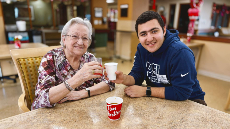Schlegel Villages neighbour Isabel Ouellette and St. Clair College student Haidar Ghassan enjoy coffee and companionship on Feb. 17, 2026. (Rich Garton/St. Clair College)
