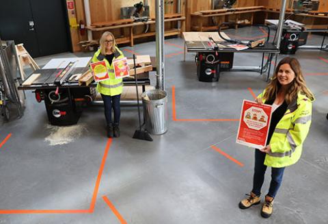 With safety the number-one priority and in strict adherence to Provincial Government public health guidelines, work continues on the Silver King Campus in Nelson for a limited return to hands-on training for students in trades-based programs. Selkirk College Health & Safety Department team members Sophie Connelly (left) and Donna Drover (right) are key to a successful recovery.