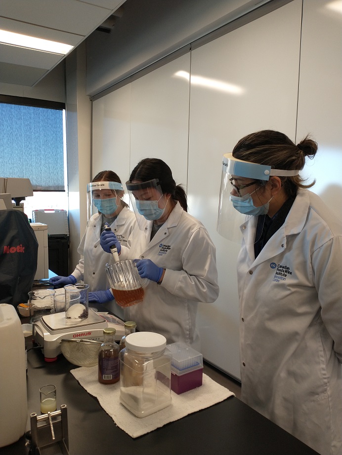 Research students Myranda Amendola (left) and Alison Wong (centre), conduct applied research work in the beverage lab of the Canadian Food & Wine Institute Innovation Centre, at NC's Daniel J Patterson Campus, under the expert eye of Ana Cristina Vega-Lugo, PhD, scientific manager of the centre.