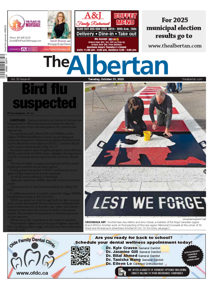 Be sure to check out this week's edition of The Albertan to learn more about the intergral role École Secondaire Notre Dame High School Grade 10 student Ava Helton played in taking Innisfail's Legion Memorial Crosswalk from concept to reality.