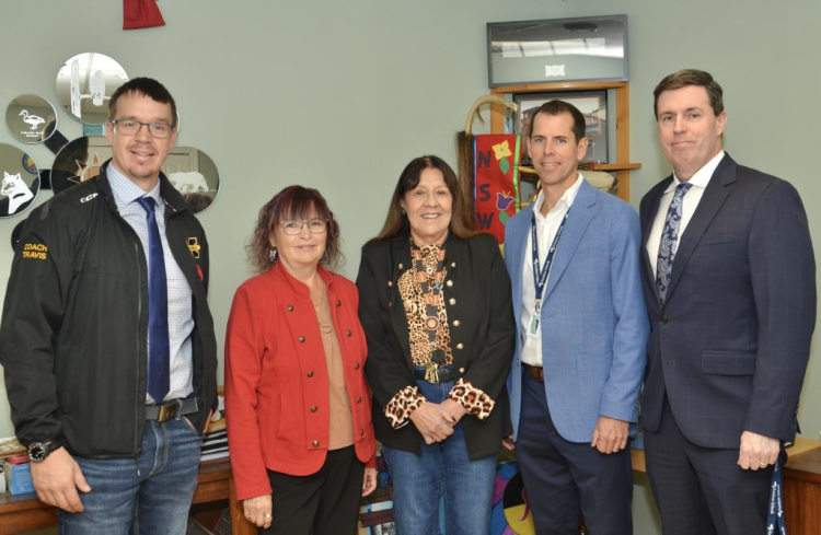 Signing the Memorandum of Understanding were, from left, Travis Corbiere, Principal of Indigenous Education for Rainbow District School Board; Kelly-Lee Assinewe, Coordinator, N'Swakamok Anishnawbek Kinomaadwin Gamig; Marie Meawasige, Executive Director of the N'Swakamok Indigenous Friendship Centre; Tim Nadjiwon, Principal of Indigenous Education for Rainbow District School Board; and Bruce Bourget, Director of Education for Rainbow District School Board.
