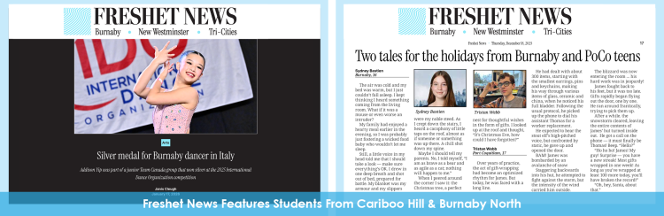 Local media outlet, Freshet News, featured Cariboo Hill Secondary student Addison Yip for earning international recognition. The Grade 9 captured a silver dance medal at the World Dance Championships in Italy as part of the junior Team Canada group. See the story here. Grade 11 student Sydney Bastien from Burnaby North Secondary was one of two youth across Burnaby, New Westminster, and the Tri-Cities to have their holiday story published. The creative writing contest was for the first print edition of Freshet News. See the student writing here (page 17).