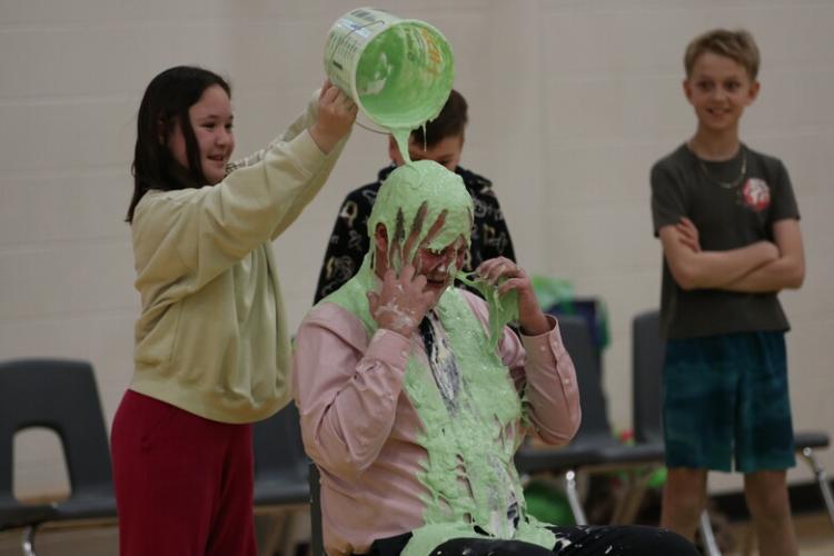 Students and members of the school community gathered to hand out prizes, which included lucky students given the opportunity to pie their teachers and slime principal Andy Tyslau.