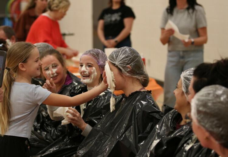 A collection of teachers, including principal Andy Tyslau, received special "treats" from students after the conclusion of a successful playground fundraiser.