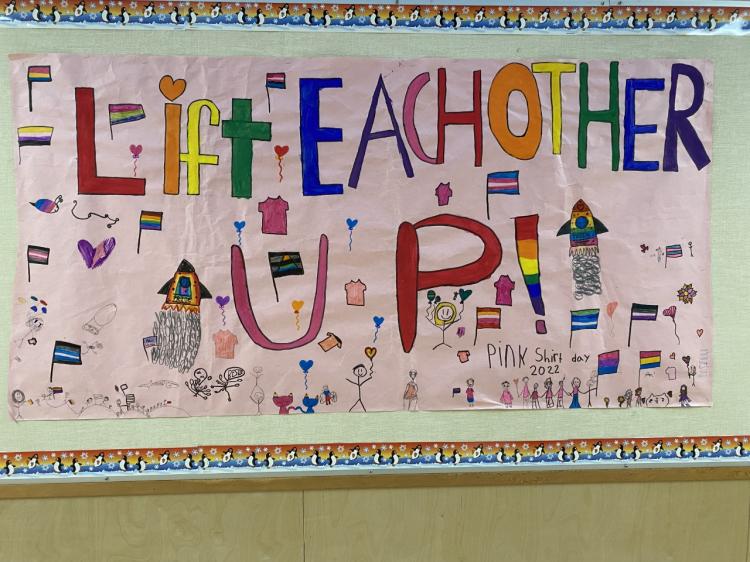 For the third consecutive year, Pink Shirt Day has followed the motto Lift Each Other Up, inspiring students to collectively raise their spirits and support one another. A few schools have already started their acts of kindness, including Grade 4 Fraser Wood Elementary students who made artwork with encouraging messages after learning the origins of Pink Shirt Day and North Surrey Secondary students and staff who put up displays.