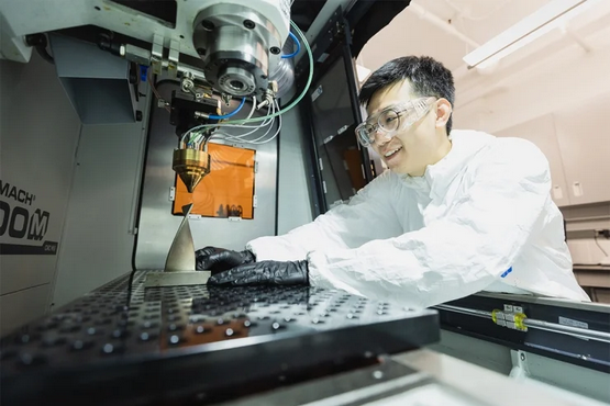 PhD candidate Xiao Shang operates the directed energy deposition 3D printer that was designed and built in the metal additive manufacturing lab of Assistant Professor Yu Zou (photo by Neil Ta)