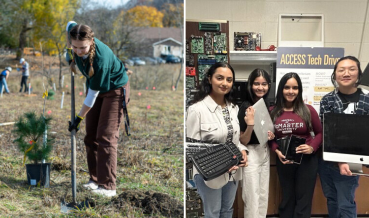 The top prizes went to students who facilitated a community tree-planting event, and a group who helped in the collection and reuse of donated technology. (Photos credits: Peter Rukavina and Matt Clarke/McMaster University).