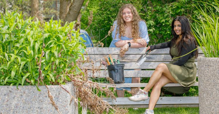 Olivia D'Andrea Brooks and Rubiga Thanganathan (L to R) studied Western's community garden in a year-long research project, part of the university's Campus as a Living Lab program. (Christopher Kindratsky/Western Communications)