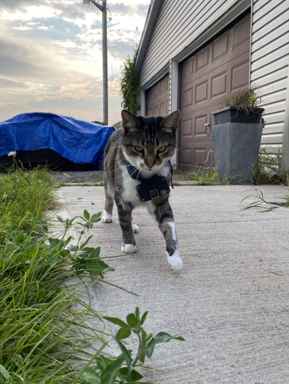 A cat wearing a catcam collar