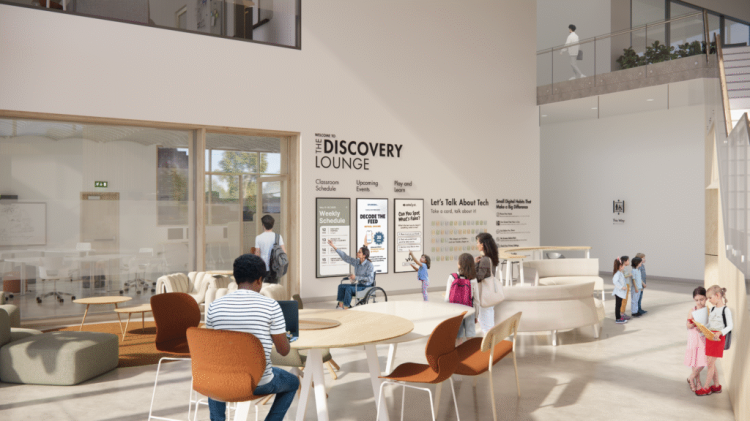 The centre blends tech-enabled learning with tech-free zones, aiming to support healthier digital habits and foster community well-being. It features a digital learning lab, a tech-free café, and a "social stair" a flexible gathering space that encourages connection, informal interaction, and casual viewing of community discussions or educational presentations within the adjacent Discovery Lounge.