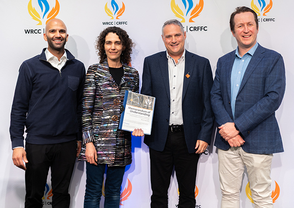 Signing the MOU (L-R): Dinyar Minocher, director, TRU Wildfire Research, Innovation and Education; Marta Yebra, director Bushfire Research Centre of Excellence, Australia; Garnet Mierau, executive director, WRCC; Andrew Gissing, chief executive officer, Natural Hazards Research, Australia. Photo credit: SitePartners.