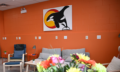 Located on the fifth floor of Angus L. MacDonald Building, the space combines areas for focused work, collaboration, and relaxation. At its heart is a bold orange accent wall, chosen for healing, remembrance, and cultural significance. A local artist will soon add a blue "river" through the orange, symbolizing movement, connection, and life.