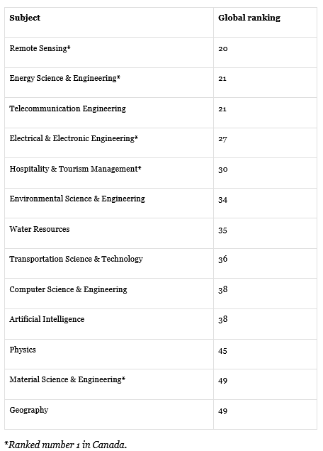 Waterloo programs ranking first in Canada include remote sensing, energy science and engineering, electrical and electronic engineering, hospitality and tourism management, and materials science and engineering.