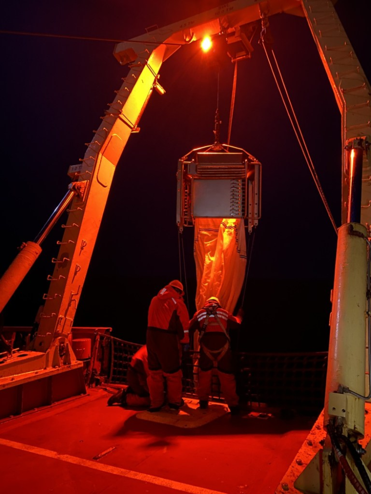 The red light reduces the effect of the Amundsen's lights on the behaviour of the organisms being sampled. A multinet is used to examine how zooplankton communities change throughout the water column. Photo: Charlotte Matthews