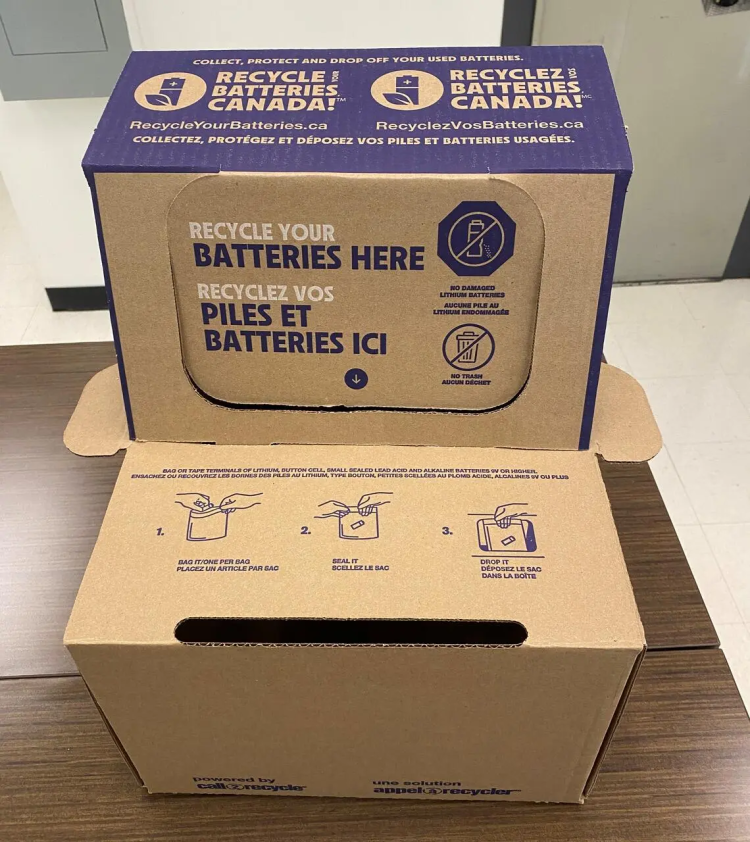 Rechargeable and single-use batteries (up to five kilograms each) from electronics, tools and small devices, can be recycled through the collection boxes located across campus. Once collected, batteries are sorted by type and chemistry and processed by certified recycling partners, where valuable materials are recovered and kept within Canada's manufacturing supply chain.