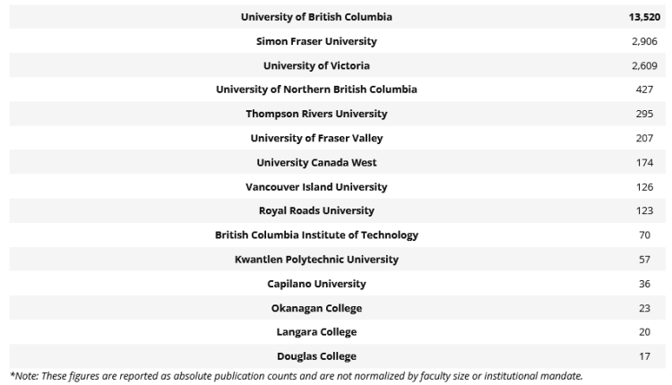 At the provincial level, when both public and private post-secondary institutions in British Columbia are considered, UCW ranked seventh overall. This performance places UCW solidly in the upper tier of scholarly production among all BC universities and colleges.