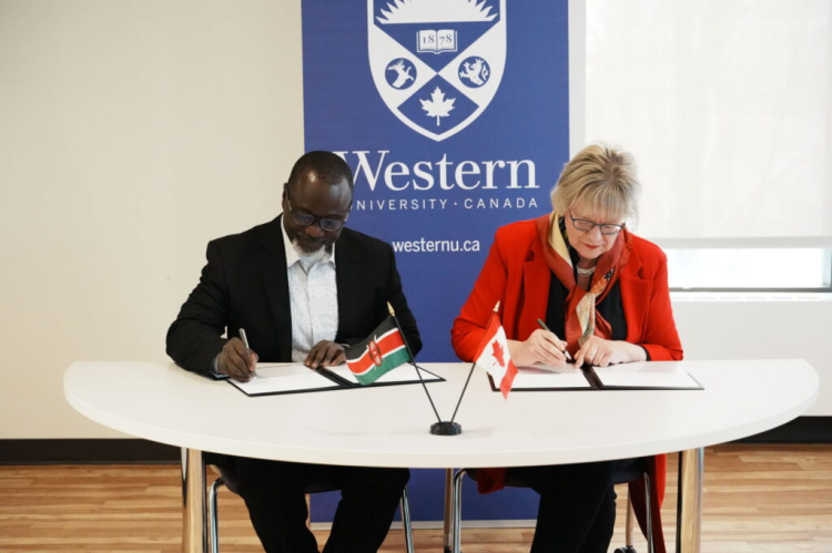 Western recently welcomed delegations from Amref International University in Kenya and Bahir Dar University in Ethiopia to strengthen partnerships that advance frugal biomedical innovation across continents. Together, they are co-developing community-driven health technologies and training programs that improve care in remote and resource-constrained communities. (L to R) Amref International University vice chancellor Joachim Osur and Western University provost and vice president (academic) Florentine Strzelczyk signed a memorandum of understanding that will create more opportunities at both universities. (Teddy Loukas/Western International)