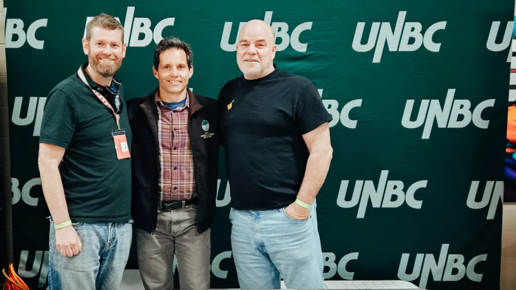 UNBC Ecosystem Science and Management Associate Professor Dr. Jamie Gorrell (left), Dan Buffet, CEO, Habitat Conservation Trust Foundation (centre) and fur trapper Glen Cartwright (right) attending the BC Trappers Association annual convention in Quesnel, B.C., to receive samples collected over the winter.