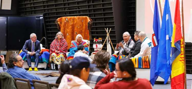 President Ed McCauley, Carol Gelette, Elder Rose Crowshoe, Elder Reg Crowshoe, Niigaan Sinclair and Michael Hart at 2025's Journey Update. Photo Credit: Riley Brandt