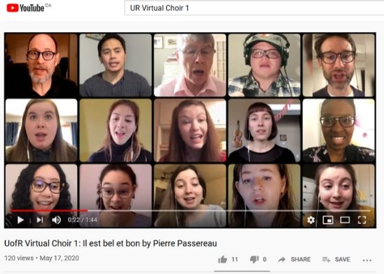 The response was amazing and the resulting 15-member virtual choir, dubbed the "UR Virtual Choir," is a testament to the power of the human spirit. As the Chamber Singers had been preparing "Il est bel et bon" for their April 5 concert, the group decided to move forward with the piece's light, fun, and uplifting madrigal style for their virtual performance. It was the perfect choice to bring hope and inspiration to the community in and around Regina, as well as to viewers the world over.