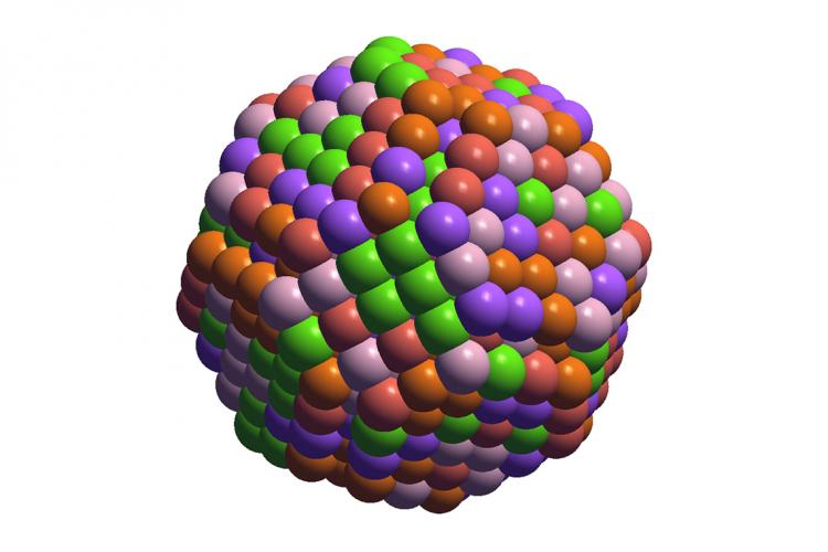 A computer algorithm developed at U of T analyzes thousands of possible geometric configurations of five different elements in order to predict which ones will have the best performance as industrial catalysts (Image courtesy of Zhuole Lu)