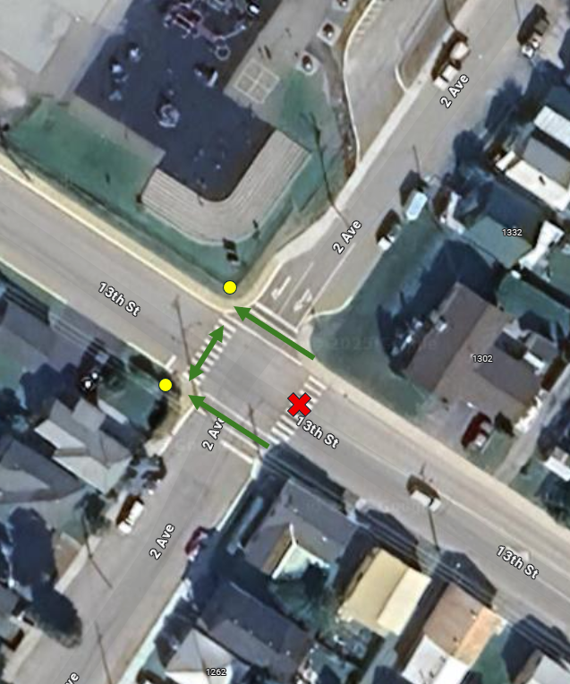 In the coming weeks, the City will be installing new pedestrian activated flashing beacons at ÉIDES for pedestrians crossing 13th Street at 2nd Ave. The beacons were purchased by the Parent Advisory Council (PAC) at School District 5 (SD5) using funding from the Province's Vision Zero Grant program. Pedestrians will be encouraged to cross only at the north side of the 2nd Ave & 13th Street intersection, as opposed to the south side of the same intersection. Pedestrians should cross 2nd Ave at the stop signs to make their way to the flashing beacons. The City will be removing the painted crossing on the other side of the intersection. This will improve the predictability of pedestrians at the intersection and reduce driver-pedestrian interaction.