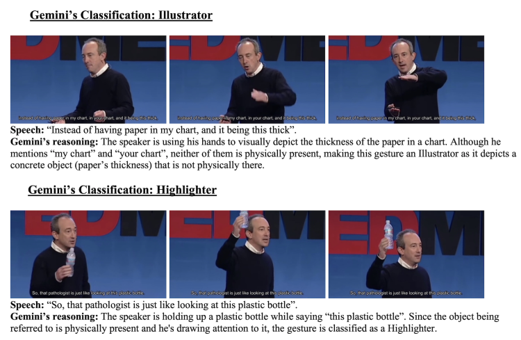 Researchers categorized gestures into types, including "illustrators," which visually depict spoken content, for example, demonstrating the size of a fish while describing it, and "highlighters," such as pointing to an object mentioned in the speech. They also examined random, unrelated movements and the absence of gestures.