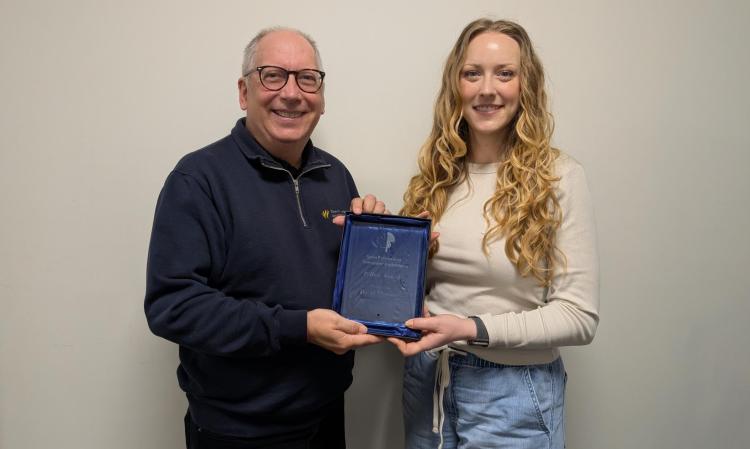 Dr. David Clements receives his CWSS-SCS award from Vanessa Jones, his former undergraduate knotweed researcher and now a PhD student at UBC, who accepted the award on his behalf. Photo by Jennifer Sinka.