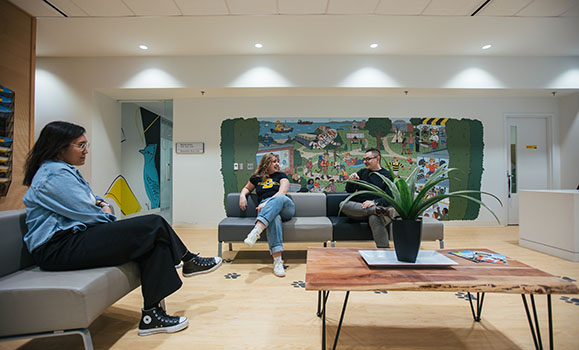 Dal Creative Studio's Andrezza Nascimento and Josh Rooney, left and right respectively, lounge in the refreshed Welcome Centre with Student Ambassador Sophia Russell.
