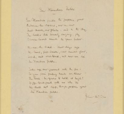 The four copies include an autographed one McCrae sent to a friend, Carleton Noyes, on May 31, 1916. The poem addressed to Noyes differs from its published version and the manuscript held at Library and Archives Canada: Its first line ends with the word "grow," instead of "blow," a possible indication that McCrae was returning to work on his poem after its publication and during its fast-spreading fame.